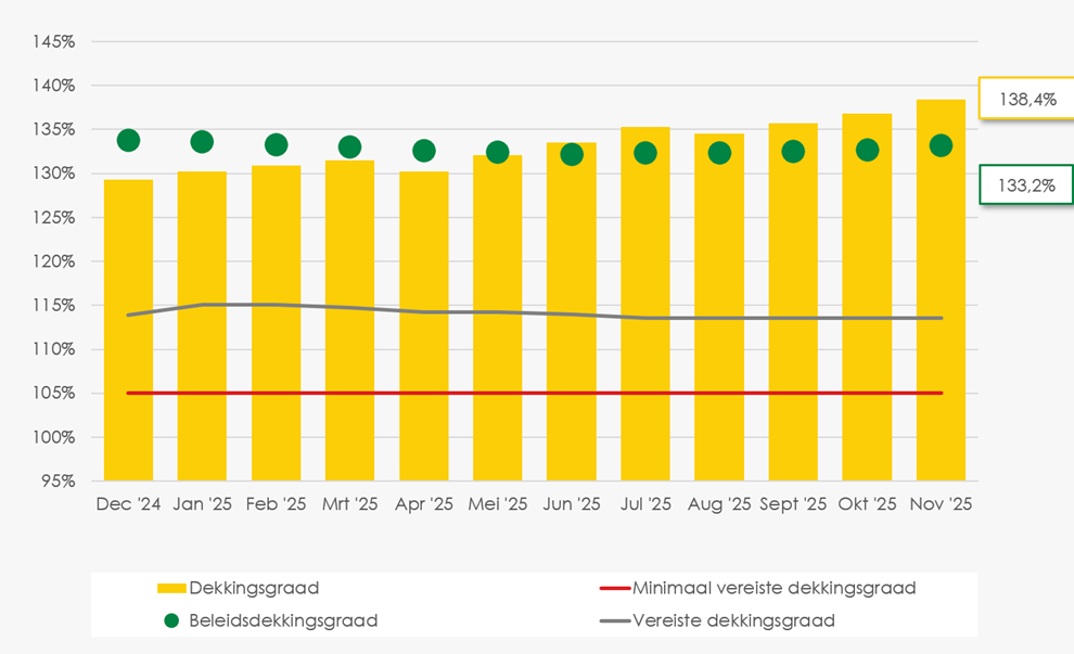 Per 30 november 2025 bedraagt de dekkingsgraad van Stichting Shell Pensioenfonds (SSPF) 138,4%. De beleidsdekkingsgraad bedraagt daarmee 133,2%. In de grafiek wordt dit over het afgelopen jaar grafisch weergegeven.