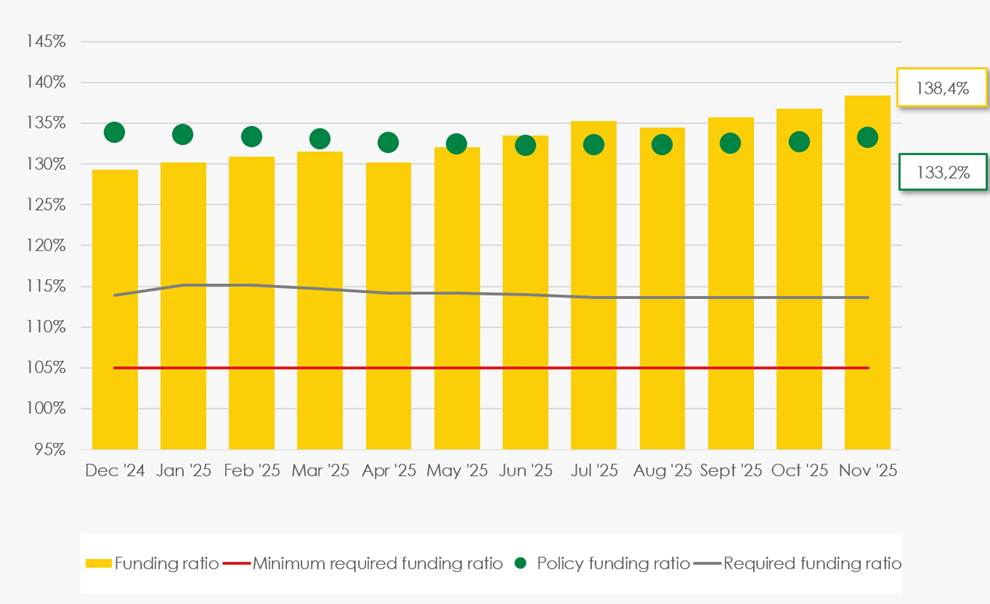 As of 30 November, the funding ratio of Stichting Shell Pensioenfonds (SSPF) amounts to 138.4%, resulting in a policy funding ratio of 133.2%. The graph shows the development of both ratios over the past year.